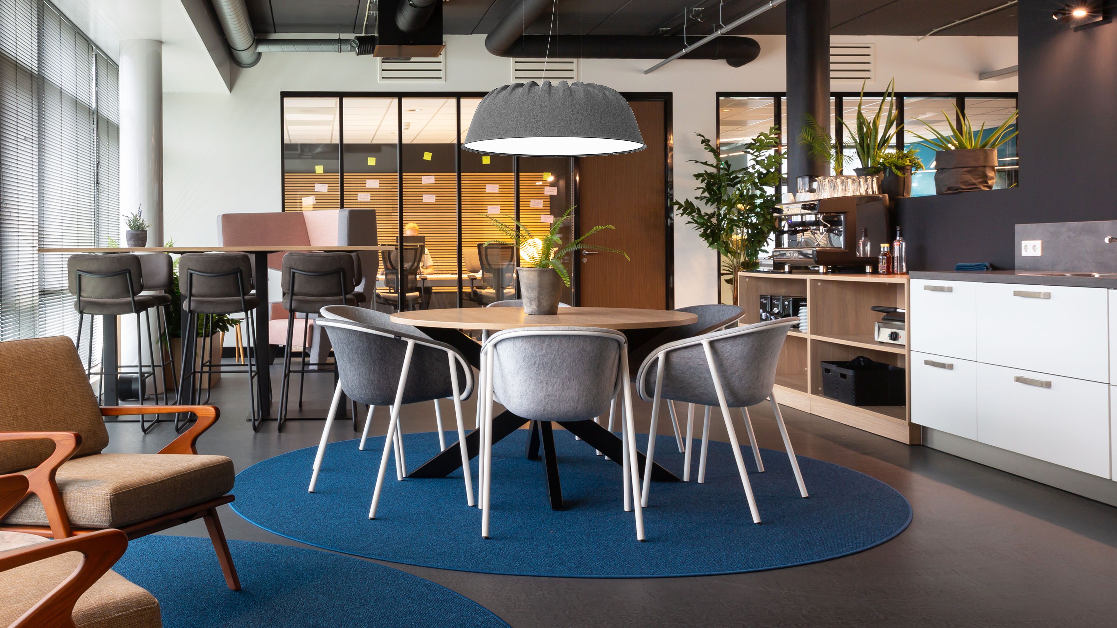 Binnen dit interieurconcept is de ‘keuken’ niet langer een eenvoudige lunchruimte, maar een veelzijdige plek voor ontspanning, koffiepauzes, informele gesprekken en flexibel werken. Door verschillende zitgedeeltes te creëren, ontstaat een multifunctionele ruimte die op diverse manieren benut kan worden.